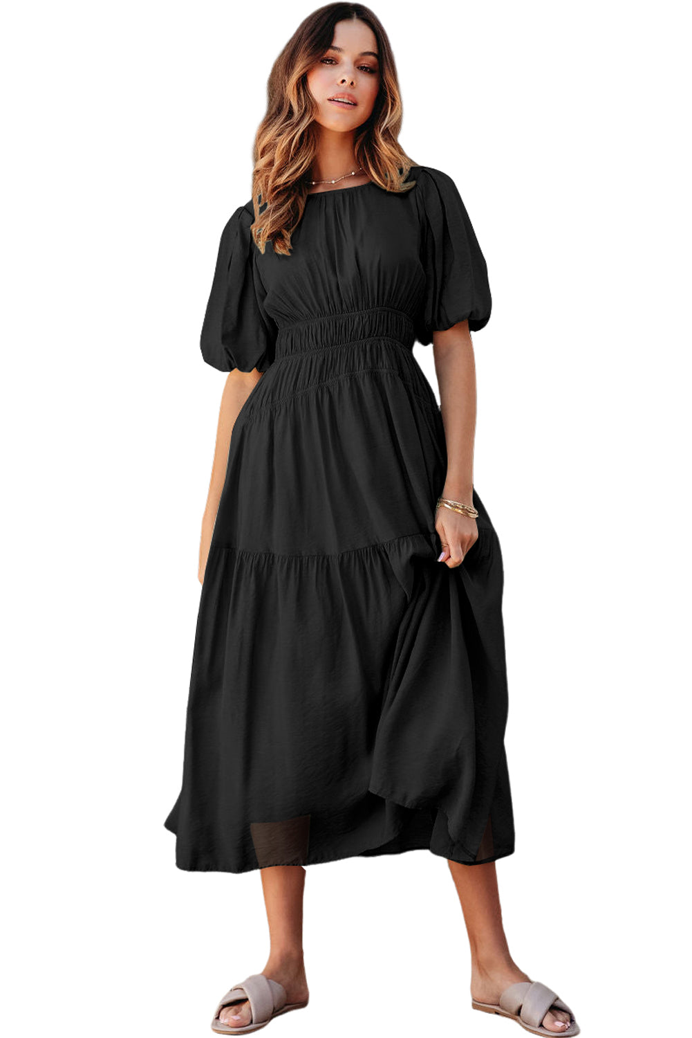 Light Blue Puff Sleeve High Waist Flowy Midi Dress