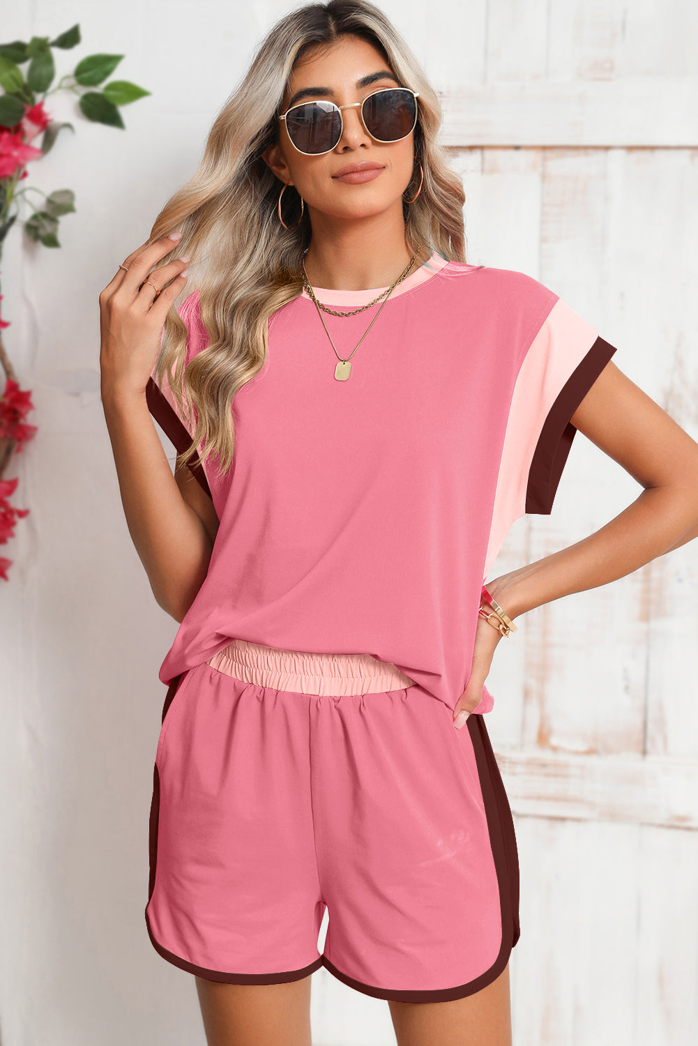 Peach Blossom Color Block Loose Fit Top & Elastic Waist Shorts Set