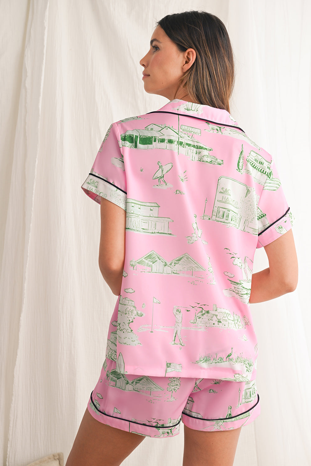 Pink Piping Detail Drawstring Shorts Pajama Set